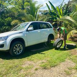 Die holprige Anreise zur Drake Bay hat am Leihwagen aber leider auch seine Spuren hinterlassen. Am ersten Morgen nach der Anreise müssen wir feststellen, dass wir eine Reifenpanne haben. Schnell ist der Reservereifen aufgezogen (bloß ein Notreifen) und unsere Gastgeber zeigen uns unweit von unserer Unterkunft eine kleine Werkstatt, die zwar nur auf Motorräder ausgelegt ist, aber hoffentlich auch Reparaturen an Autoreifen durchführt.