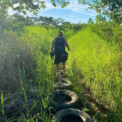 Zum Strand sind es zu Fuß nur ein paar Meter. Hierfür müssen wir aber durch eine stark zugewucherte Lagune hindurch. Der Wasserpegel schwankt je nach Flut um bis zu 30 cm und so ist es manchmal nicht ganz einfach sich seinen Weg durch das modrige Wasser zu bahnen. Auch die Reifen, die den Weg markieren sollen, helfen dann nur noch bedingt. Gibt es hier neben den Schlangen eigentlich auch Krokodile? 🐊
