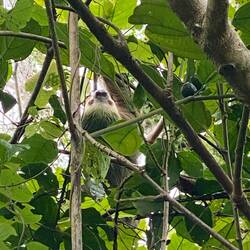 Heute scheint unser Glückstag zu sein, denn unsere Geduld zahlt sich aus und unsere Suche wird belohnt. Nach mehr als drei Stunden finden wir endlich das lang ersehnte dösende Faultier hoch oben in einer dichten Baumkrone. Ob es ein Zwei- oder Dreifinger Faultier ist, können wir leider nicht erkennen.