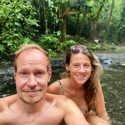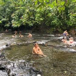 Etwas außerhalb von La Fortuna gibt es eine heiße Quelle, die kostenlos ist und keinem Resort gehört. Wir müssen nur 3000 Colones bezahlen, damit wir unser Auto sicher parken können. Allerdings besagt der völlig zugeparkte Straßenrand, der als Parkplatz dient, nichts Gutes und je näher wir der Quelle kommen, desto lauter wird es.