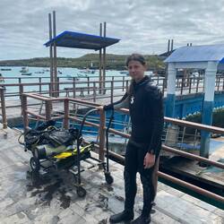 Skills, wie zum Beispiel die Kommunikation unter Wasser, werden im Hafenbecken direkt vorm Pier in 5m Tiefe geübt. Dabei bekommen wir wieder Gesellschaft von vielen neugierigen Seelöwen, die unsere kleine Tauchgruppe umkreisen.