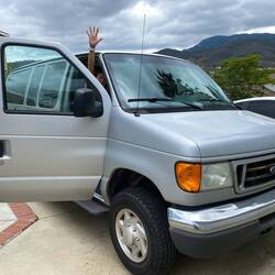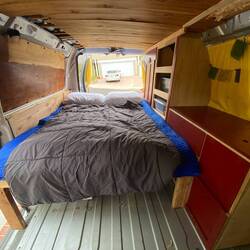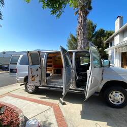 Der 2006er Ford E350 Van war vorher als Wohnmobil umgebaut, steht momentan aber bis auf ein paar Einbauschränke leer. Aus einer Mischung aus Holzresten und OSB Platten, die wir uns noch im Baumarkt besorgen, bauen wir uns in den nächsten 2 Tagen kurzerhand unser neues Bett zusammen. Eine bereits vorhandene Matratze und Decken dürfen wir uns sogar aus der Garage nehmen. Auch einiges an Campingmaterial ist noch vorhanden und findet dankbar seinen Weg in das Auto.