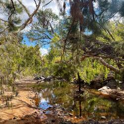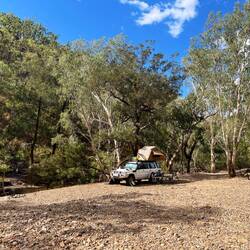 Nach dem anstrengenden Tag schlafen wir wie kleine Babies. Der Platz, den wir in der Dunkelheit notgedrungen ausgesucht haben ist wirklich nicht schön, und so packen wir gleich nach dem Kaffee das Zelt ein und fahren etwas weiter. Nach nur ein paar hundert Metern werden wir schließlich fündig und finden im trocken Teil des Flussbettes einen tollen Platz, direkt am Flussufer des nun in der Trockenzeit verbliebenen Rest des Emu Creeks. Wir müssen hier zwar über lose Steine fahren, aber es sieht stabil genug aus und wir kommen gut durch.