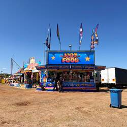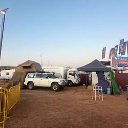 Wir campen etwas abseits der Rodeoarena auf der Sideshow-Alley, wo die Foodtrucks und Fahrgeschäfte innerhalb einer Pferderennbahn stehen. Der Boden ist extrem trocken und der rote Sand wird ständig von Autos, Pferden und dem Wind aufgewirbelt und legt sich schließlich auf alles nieder. Unsere Campingausrüstung stauben wir täglich ab, aber wir kommen kaum hinterher. Auch unsere Lungen spüren wir abends und sind froh, wenn wir uns ins Zelt verkriechen können.