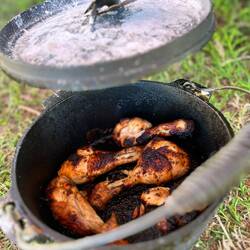Ansonsten erkunden wir die nähere Umgebung, machen den ein oder anderen Fund im örtlichen Op-Shop (Das sind Second-Hand Läden), helfen einer kleinen Schildkröte bei ihrem Versuch die Straße zu überqueren und probieren wieder etwas neues in unserem Campoven aus. Die Hähnchenschenkel werden kurz in der Pfanne angebraten und danach im gusseisernen Topf direkt in der Glut des Lagerfeuers fertig gegart. Damit auch von oben Hitze kommt, legen wir auch etwas Glut auf den Deckel. Das kommt einem echten Backofen schon sehr nah :) 🍗