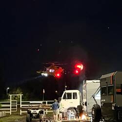 Er erleidet starke Verbrennungen am Oberkörper. Zum Glück ist ein Krankenwagen unmittelbar in der Nähe und auch innerhalb von 5 Minuten vor Ort. Er alarmiert schließlich noch einen Rettungshubschrauber, der auch einen Arzt mitbringen soll. In der Dunkelheit wird mit unseren Fahrzeugen der Platz ausgeleuchtet, damit der „Chopper“ einen sicheren Landeplatz finden kann. Schließlich wird der Verletzte noch am Abend in ein knapp 1.000km entferntes Krankenhaus geflogen…