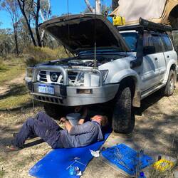 Nun machen wir uns daran das Thermostat zu wechseln. Dies ist sehr schwer zu erreichen und ein echter Kraft- und Nervenakt beim Patrol. Arons Flüche verhallen zum Glück unterm Auto und auch sonst ist keiner im Wald, der es hören könnte. Lara kennt es eh nicht anders…