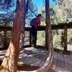 Diesmal parken wir unser Auto aber zentral und beschließen von dort aus noch eine kurze Runde am Dove Canyon zu wandern. Der Weg ist anfangs noch recht flach, bringt uns aber bald durch den knorrigen Wald immer tiefer hinunter. Kurz darauf sind wir oberhalb der Schlucht des Dove Canyon angekommen. Lautes Rauschen des Flusses ist zu hören. Ein vorsichtiger Blick über die Kante lässt uns den Magen umdrehen. Hier geht es wirklich steil runter. Nur eine kleine Absperrung trennt uns vom Abgrund.