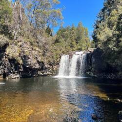 Es geht weiter flussaufwärts an den Klippen und zwei Wasserfällen vorbei, bis es immer flacher wird. Kurz bevor wir wieder am Auto sind, läuft uns noch ein wildes Wombat über den Weg. Es lässt sich von uns nicht stören, während wir ihn für ein paar Minuten beobachten. Ein Funfact zum Wombat: der Kot ist würfelförmig.