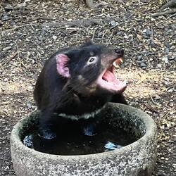 Das Brüllen des Tasmanischen Teufels ist eine Mischung aus fauchendem Schrei und Grunzen und klingt gruselig. Die Drohgebärde dazu gleicht einem lautlosen Gähnen bei dem alle Zähne gezeigt werden. Kein Wunder also, das die ersten Siedler sie damals für Teufel hielten.