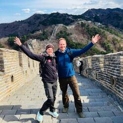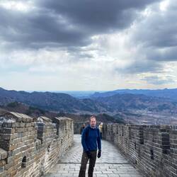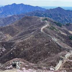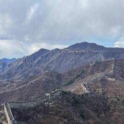 Der Blick auf die Mauer mit den umliegenden Bergen und Tälern ist sagenhaft. Wir haben einen perfekten Tag erwischt. Es ist mit 10 Grad recht kalt und ein paar eisige Böhen wehen uns um die Ohren, aber dennoch sind kaum Wolken am Himmel, die Sonne scheint und die Sicht ist klar. Wir können sogar das 70km entfernte Peking sehen.