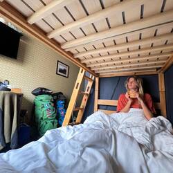 Unser Zimmer im 4. Stock ist klein, aber modern und fast sauber. Leider war nur noch ein Stockbett frei. Lara war dran mit Bettaussuchen (doch, das ist ein echtes Wort!) und schläft oben.