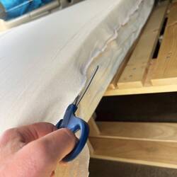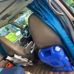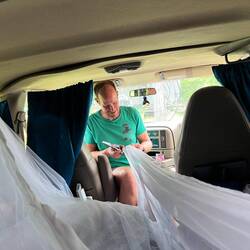 Für Privatsphäre kaufen wir im Walmart einfache, aber blickdichte Vorhänge, die wir anpassen und dann rundum mit einer Schnur und Haken an den FensternLæs mere