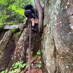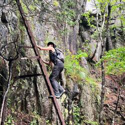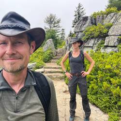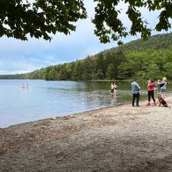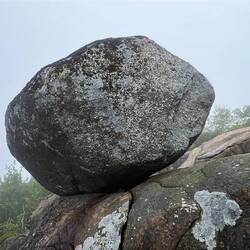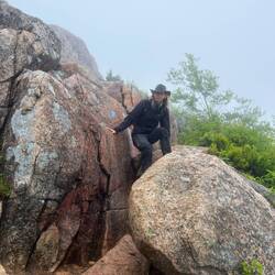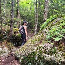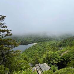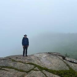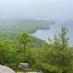 Wir fahren ein paar Kilometer weiter und schnüren die Wanderschuhe. Mit Ponchos, Regenjacken und Regenüberzügen gewappnet, stapfen wir durch den Wald zum Jordan Pond, über den Eagle Lake und dann weiter zum Bubble Rock. Zwischendurch müssen wir ganz schön an rutschigen Felsen entlang klettern. Es ist permanent am nieseln und manchmal ziemlich rutschig, aber wir schaffen es ohne Blessuren wieder zurück zum Auto.