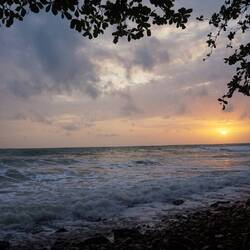 Es ist Abend, die Sonne geht grad unter und wir sind etwas abseits an einem ruhigen Strandabschnitt.