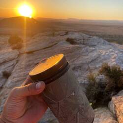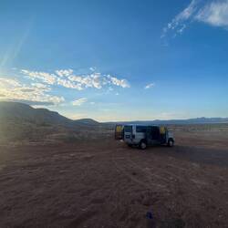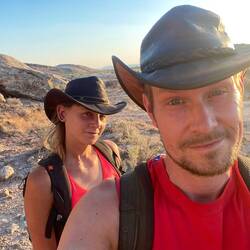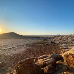 Es dauert nicht mehr lange bis zum Sonnenuntergang, also machen wir uns auf den Weg zu einem der großen Felsmassive südlich unseres Camps. Von dort oben aus ist die Sicht über die Umgebung bestimmt grandios.
