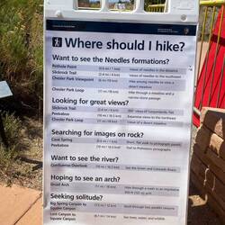 Nach einer ganzen Weile kommen wir endlich am Südeingang des Canyonlands Nationalparks an. Der Park ist ziemlich groß und wird, wie vorher schon beschrieben, in mehrere Abschnitte eingeteilt. Die beiden Hauptattraktionen sind „The Needles“ im Südteil und „Island in the Sky“ im Nordteil. Allerdings sind die Abschnitte nicht miteinander verbunden, sodass man den Park verlassen und der andere Teil wieder von außen angefahren werden muss. Das erfordert ein wenig Planung und bedeutet mehrere Stunden Fahrt.
