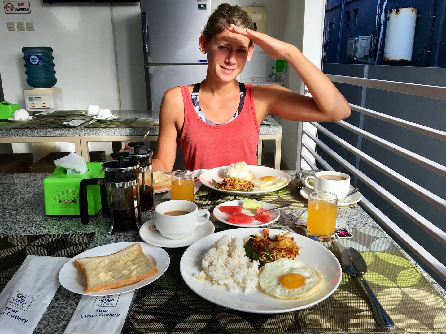 Morgens wurden wir etwas unsanft von einem Telefonanruf der Rezeption geweckt, dass unser Frühstück fertig wäre. Es durchzuckte uns fast wie ein Blitz, denn wir hatten wieder mal über 11 StundenBaca lagi