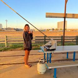 Hier treffen wir auf alte Bekannte, die wir 2019 bereits einige Zeit mit ihrem Foodtruck und Spielbuden über die Jahrmärkte und Rodeos an der Ostküste Australiens begleitet haben. Lara hat außerdem gern auch als Babysitter während der Shows gedient. Die Wiedersehensfreude ist auf beiden Seiten groß 🥹