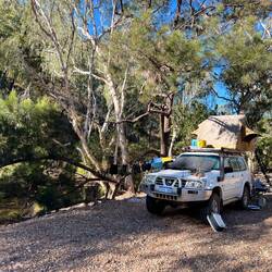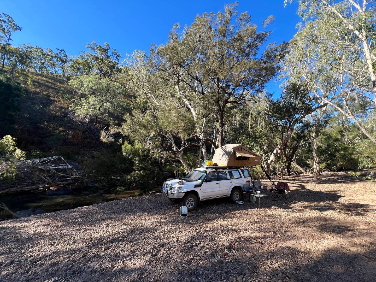 Nach dem anstrengenden Tag schlafen wir wie kleine Babies. Der Platz, den wir in der Dunkelheit notgedrungen ausgesucht haben ist wirklich nicht schön, und so packen wir gleich nach dem Kaffee das Zelt ein und fahren etwas weiter. Nach nur ein paar hundert Metern werden wir schließlich fündig und finden im trocken Teil des Flussbettes einen tollen Platz, direkt am Flussufer des nun in der Trockenzeit verbliebenen Rest des Emu Creeks. Wir müssen hier zwar über lose Steine fahren, aber es sieht stabil genug aus und wir kommen gut durch.