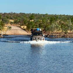 Der Durack River hat eine Breite von etwa 80m, vor der man, steht man mit seinem Auto davor, schön gehörig Respekt bekommt. Hier müssen wir schließlich durch!
