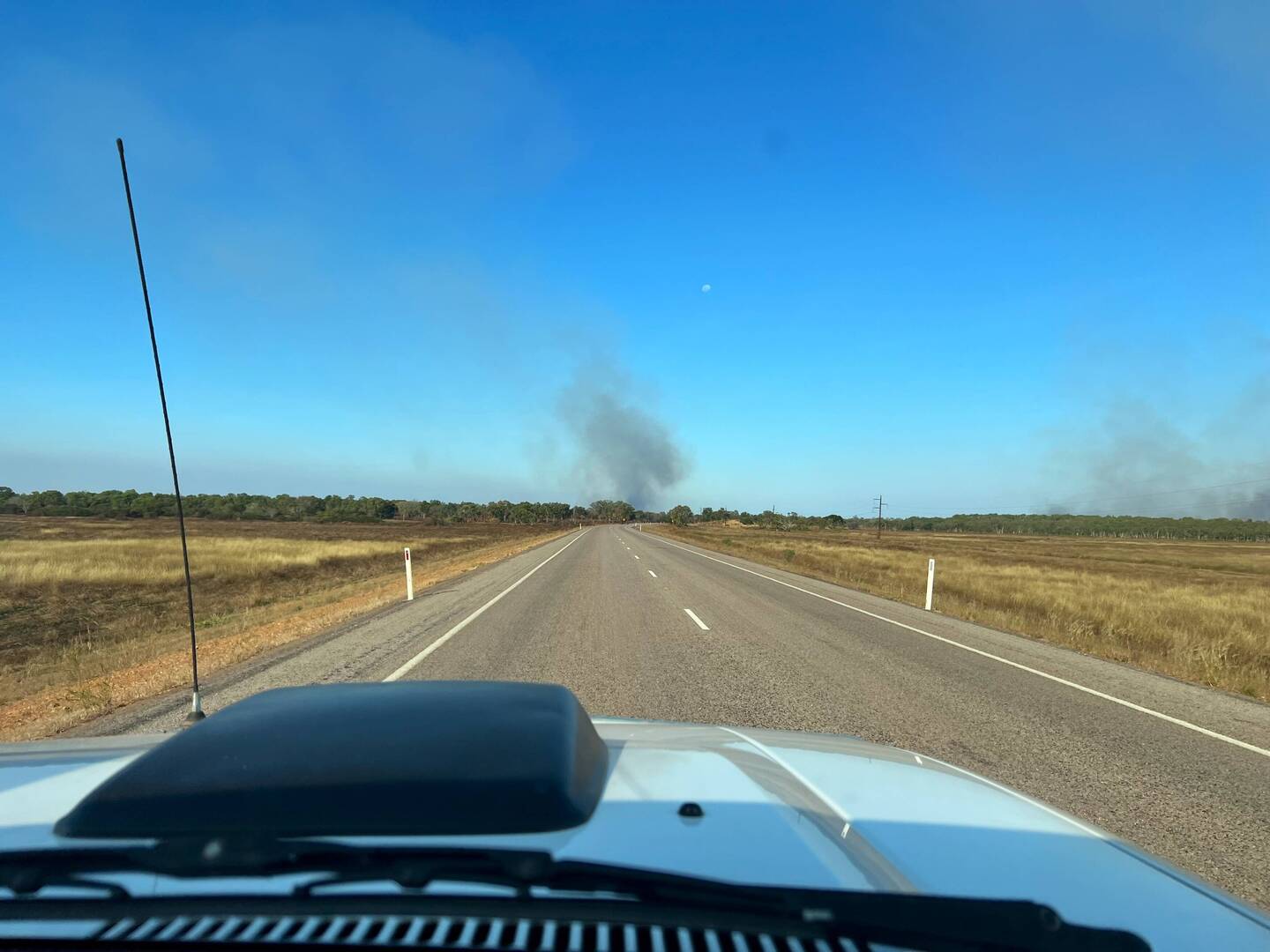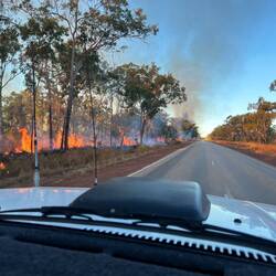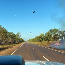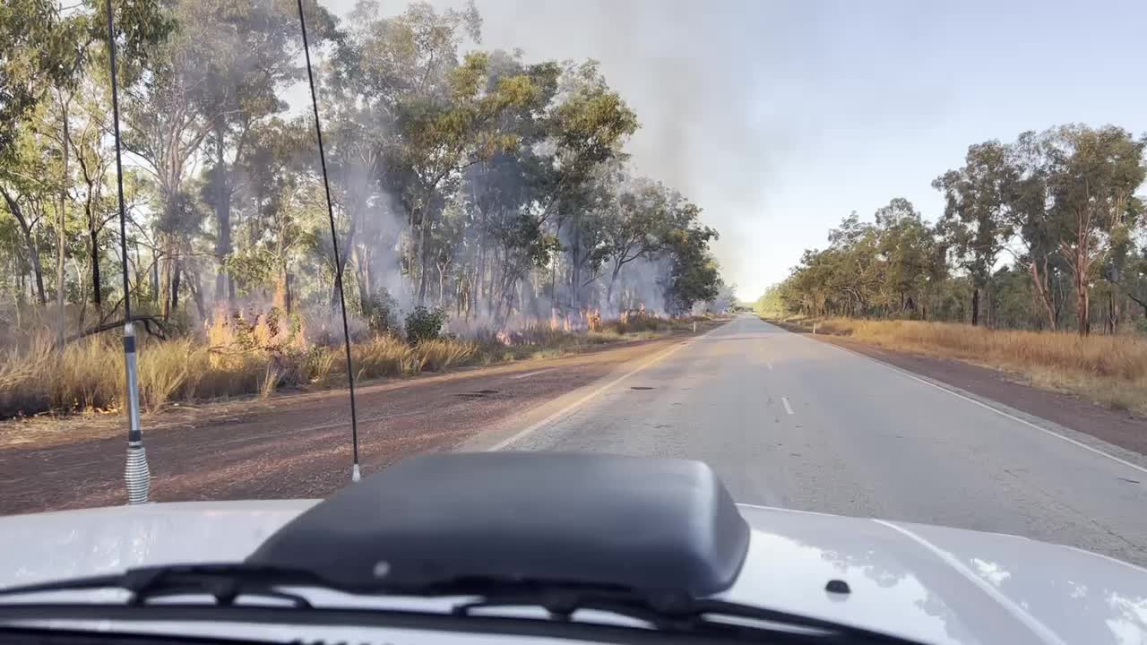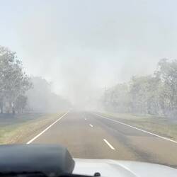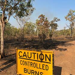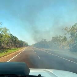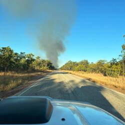 Diesmal müssen wir durch gleich mehrere Buschfeuer fahren, bei denen es sich aber um kontrollierte Abbrennungen handelt.