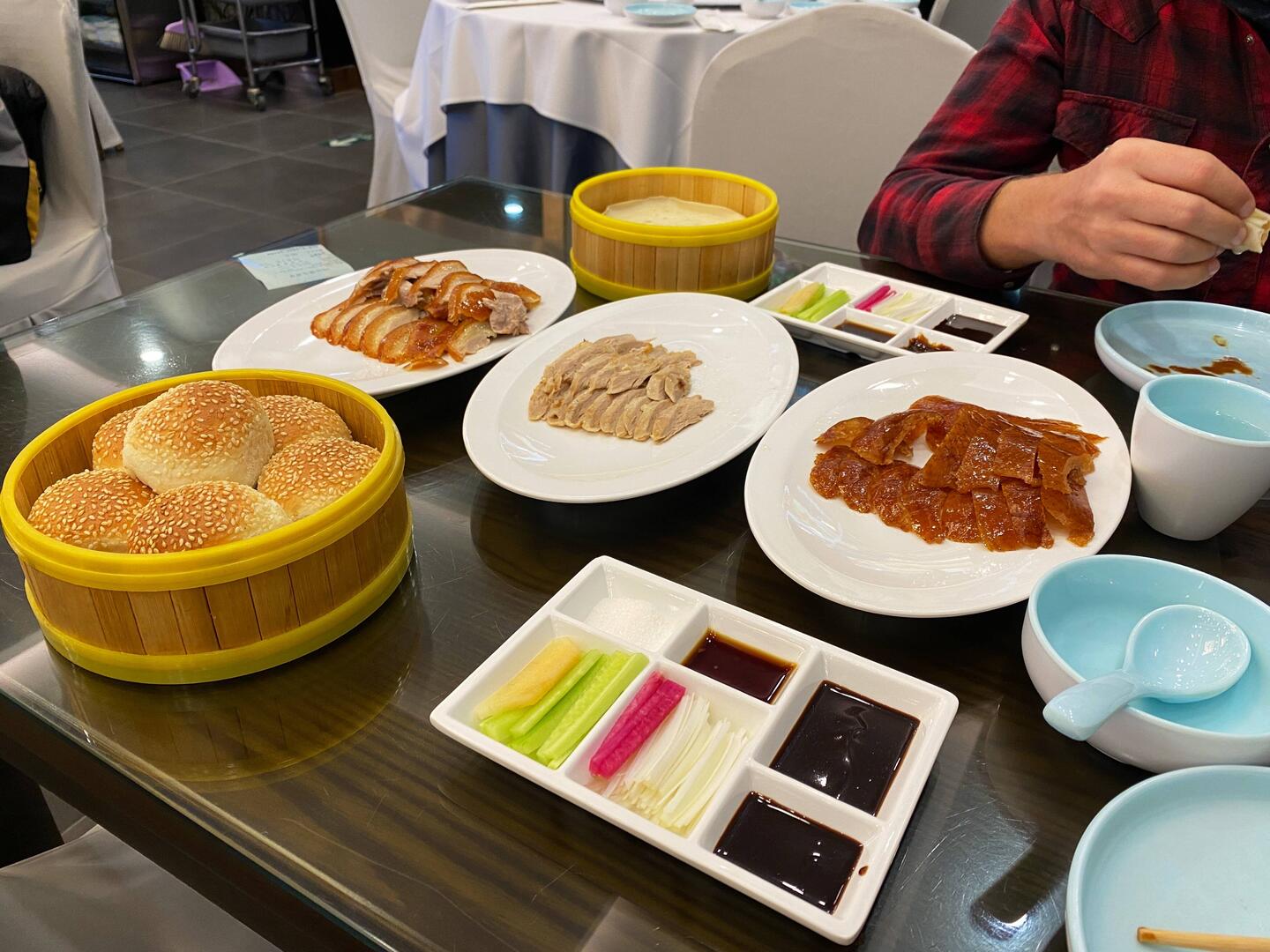 Es werden getrennt knusprige Haut, reine Entenbrust und eine etwas fettigere Mischung aus beidem auf den Tellern angeboten. Dazu gibt es für unseren Geschmack etwas zu mehlige Brötchen, fein geschnittene Gemüsestreifen, verschiedene Sojasaucen und vor allem Weizenwraps.