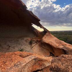 Bei Start der Wanderung sind es bereits 26 Grad, es sollen heute noch etwa 32 Grad werden. Die knapp 7.5km Route führt im großer Runde um einige der riesigen Felsen herum und an sehr schönen Ausblicken vorbei. Wir müssen hier und da ein nur wenig klettern, aber es ist eine recht einfache Route. An mehreren Stellen gibt es sogar Trinkwasser und schattige Unterschlupfe.