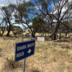 Ein paar Kilometer weiter biegen wir nordwärts vom Highway ab und finden ein weitläufiges Camp mitten im Busch in der Nähe des „Shark Mouth Rocks“, dem wir einen Besuch abstatten. Der Fels sieht tatsächlich aus wie ein Hai, der das Maul weit aufreißt und ist ein heiliger Platz der Aborigines.