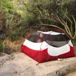 Gegen Mittag sind wir im „Rocklands Basecamp“, einem kleinen aber feinen Zeltplatz angekommen. Ein etwas verpeilter Typ sitzt an der „Rezeption“ - eine Art Schuppen im Nirgendwo - und versorgt uns mit den wichtigsten Infos und einem Crashpad - damit wir hinreichend sicher vom Fels abtropfen können…