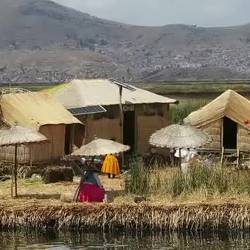 Wir fahren mit einem Boot zur Isla Suchi Maya und werden dort nach einer kleinen Vorführung über die Bautechnik der Inseln von Maria, der angeblichen 'Inselchefin', in ihr Haus eingeladen. Nach einem kurzen Smalltalk kennt sie unsere Namen, die sie dann später auf ihrem kleinen Kunsthandwerkermarkt dazu missbraucht, uns ständig zu rufen, damit wir einen ihrer Wandteppiche kaufen. Wir kaufen nichts, schließlich haben wir nur einen Rucksack, den wir noch einige Zeit tragen müssen! Später werden wir mit einem aus Schilf gebauten Boot, angetrieben von zwei rudernden Urus, entlang der vielen, vielen Inseln gefahren. Eine schöne und entspannende Fahrt. Sehr interessant zu sehen wie hier seit vielen Jahren und Jahrhunderten gelebt wird, auch wenn es heute auf der ein oder anderen Insel seit neuestem Photovoltaikanlagen gibt. Übrigens: Die Urus zahlen keinerlei Steuern und Abgaben... wären wir nicht alle gerne Urus... 😜