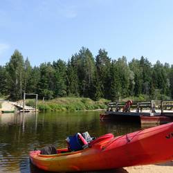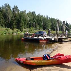 Nein, alles ganz easy. Fünf kleine "Stromschnellchen" sind es nur, die die ansonsten langsame Gauja etwas beschleunigen. Trotzdem ein grosser Spass! Nach knapp vier Stunden erreichen wir nach 17km Ligatne, den Ort mit der kleinen handbetriebenen Fähre, auf die nur ein Auto passt.