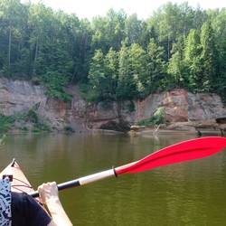 Los gehts. Nach ein paar Metern dümpeln wir bereits bei Hymi vorbei und dann ist nur noch ursprüngliche Natur um uns - inkl. etlicher Bremsen, die über uns herfallen. Da hilft nur die Chemiekeule, die nun grossflächig alles abdecken muss. Mehrheitlich erfolgreich, teilweise nicht... Wir paddeln stromabwärts die Gauja entlang. Gleich nach ein paar hundert Metern entdecken wir einen Eisvogel, den wir zum ersten Mal in der Natur so sehen. Leider war die Kamera im Beutel😬. Na gut, manchmal ist das Foto im Kopf auch das bessere😉.