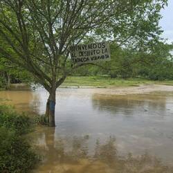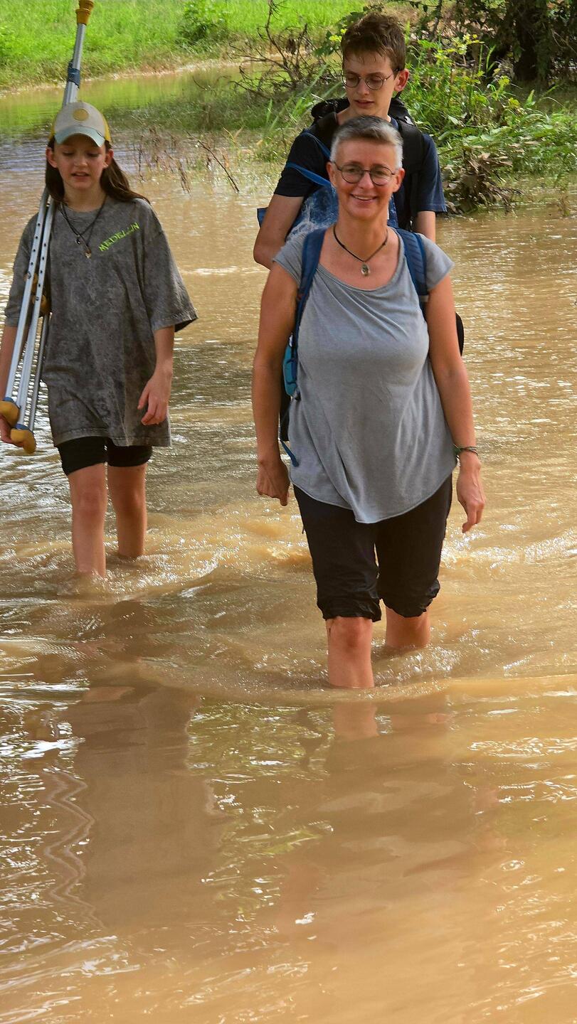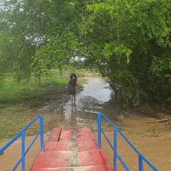 Wrong! At least when it rains so hard that the river bursts its banks and the last km to the river is totally flooded. The water is above my knees, and for Oscar, it's so high he puts on swim trunks.