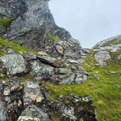 Schon kurz nach Mitternacht hat es angefangen, leicht zu regnen, seit morgens um fünf richtig kräftig mit einigermaßen Wind dazu. Für mich umso mehr ein Grund, etwas länger liegen zu bleiben und selig bis halb neun zu schlafen. Da es unentwegt regnet, bereite ich mich gedanklich auf das Packen unter Regenbedingungen vor, also alles unterhalb des Zeltcovers zu verstauen und am Ende nur noch die Außenhülle wegzunehmen. Circa um halb elf ist es dann auch so angerichtet und just ab diesem Moment ist auch der Regen vorbei. Das kann ich jetzt positiv sehen oder positiv: Ich muss ab jetzt nicht im Regen durchs Bergwerk ziehen, es ist schon ausreichend, dass alles nass und schmierig ist. Und so ziehe ich auf c² weiter in Richtung Snåsa bei tief hängenden Wolken und einer gewissen Feuchtigkeit in der Luft. Ich habe mir in gut 3km einen Punkt ausgeguckt, auf den ich zusteuere. Da es immer wieder durch irgendwelche Senken geht, ich immer wieder um kleine Seen, Wasserstellen, Morast oder auch steile Steinkanten herumlaufen muss, mal 50 m hier nach rechts, 100 m da nach links, habe ich immer einen Fixpunkt, den ich ansteuere. Mit der Zeit habe ich Gefallen gefunden an diesem völlig unabhängigen Laufen ganz nach meinem Gusto, ich bestimme und bekomme lediglich von der Landschaft und vom Wetter hier und da ein paar Ansagen dazu. Natürlich muss ich immer im Auge behalten, dass der Brotkorb jeden Tag ein Stück weiter nach oben gezogen wird, denn ich habe keine gute Vorstellung davon, völlig gesund hier draußen irgendwo zu hocken, am Ende die Rettung anzurufen und mitzuteilen, die Vitalwerte sind ok, aber ich bräuchte hier ein halbes Schwein auf Toast.