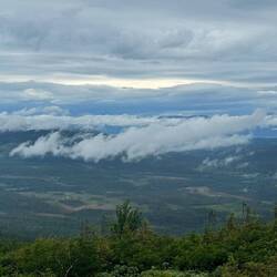 Bis um halb zwei ungefähr geht es in ziemlichem Zickzack durch diese Berge mit wenig Sicht. Allerdings löst sich der Nebel günstigerweise ein wenig auf, so dass ich etwas weitersehen kann und um halb zwei erreiche ich tatsächlich, ohne dass ich es erwartet hätte, den Pfad, der Richtung Westen führt. Er ist gut erkennbar und auch mit Steinen und teils roten Punkten als solcher gekennzeichnet. Fein, ab jetzt geht es erst mal für einige Zeit bergabwärts entlang eines gut zu laufenden Weges. Während ich so laufe, sehe ich in dieser riesigen weißen Nebelwand vor mir ein helles Licht im Hintergrund. Und kaum habe ich ein Foto davon gemacht und betrachte es, gucke ich wieder in diese Richtung und es hat sich in anderthalb Minuten völlig das Bild verändert: Vor mir liegt ein offenes Tal mit Wäldern, großen Weideflächen, ich kann einige Häuser sehen. Spektakulär die Farbkonstellationen der Wolken von schneeweiß bis hin zu tief dunkelblauen. Vor diesem hellen Licht ist das ein fantastisches Spektakulum mit schnell wechselnden Szenen. Sofort werfe ich alles ab und lasse mich hier zur großen Pause nieder, um dieses Schauspiel zu betrachten. Ich habe zwar bis nach Snåsa noch 30km zu laufen, aber kann tatsächlich, so lange der Vorhang geöffnet ist, in 15km Luftlinie den See sehen, an dessen Ende der Ort liegt.