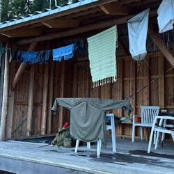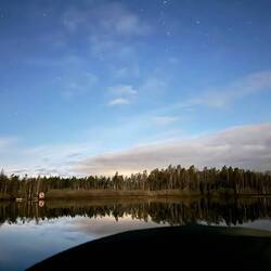 In der Nacht hat es angefangen zu regnen, das hat sich durchgezogen bis heute. Der geplante Ruhetag fällt buchstäblich ins Wasser, da es bis nachmittags um vier bis auf wenige Unterbrechungen mehr oder weniger stark regnet. Dementsprechend bin ich fast den gesamten Tag im Zelt, schreibe Tagebuch, döse rum und nähe zwei defekte Stellen an meiner Hose, die ich gefunden habe. Außerdem kümmere ich mich ein wenig um das Bein, das aber deutlich auf dem Weg der Besserung ist. Zwischendurch gehe ich mal runter an den See und wasche mich. Am Nachmittag ab circa um fünf, als es aufgehört hat zu regnen, gehe ich ein paar Meter durch den Wald und am Ufer entlang, später runter ans Wasser bei meinem Zeltplatz. Lege mich wieder auf dem großen Stein auf die Isomatte und genieße eine gute Stunde lang den frühen Abend. Es ist auch nicht kalt, zumindest nicht für diese Verhältnisse.Read more