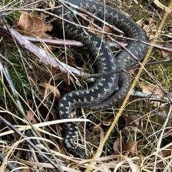 Während ich weiterlaufe, will ich schon mal ein Restaurant heraussuchen, in dem ich mich mit Tobi treffen kann, da er schon eine grobe Ankunftszeit mitgeteilt hat. Ich muss mit Erschrecken feststellen, dass in Kinnared das einzige Restaurant heute um zwei schließt. Nach einigem Hin und Her entscheide ich, dass wir uns dann doch in Hyltebruk treffen, der einzige Ort, der Restaurant und Supermarkt hat. Für mich heißt das, ab jetzt ein Stück auf meinem Weg zurück zu laufen und dann muss ich an der Bundesstraße einen guten Kilometer direkt entlang. Das ist wahrlich keine Freude auf dem Randstreifen. Teilweise am Rand mit Leitplanken und beidseitig mit Wildzaun donnern die LKWs in nur 1 Meter Abstand an mir vorbei. Da ich nicht sicher bin, ob das überhaupt erlaubt ist und die Polizei nicht auf den Plan rufen möchte, gehe ich nach circa einem halben Kilometer an einem Tor durch den Wildzaun und finde einen Weg, der parallel zur Straße im Wald verläuft. Der endet aber nach gut 200 m, weil hier tief in den Stein gehauen eine Einfahrt runter in einen Schacht geht. Vielleicht gehört das zu einem Kraftwerk, ich kann es nicht einschätzen. Ab hier schlage ich mich durch dichtestes Waldgebiet hinter dem Wildzaun entlang, manche Stücken kann ich direkt am Zaun laufen. Da passe ich gerade mit dem Rucksack durch, dann aber auch wieder nicht und muss wieder direkt durch das Unterholz. Während ich mich hier durchkämpfe, liegt sie auf einmal vor mir: eine Kreuzotter, die auch bis an den Wildzaun herangekommen ist (und keinen Schritt weiter;) und hier zwecks fehlender Bäume die paar Sonnenstrahlen und Wärme genießt. Wir einigen uns darauf, dass sie sich in den Wald verzieht, damit ich am Zaun weiterlaufen kann. Ich bin froh, als ich dieses Stück irgendwann durchhabe und es wieder einen Weg gibt, der mich am Jakobssjö entlang führt. Ich muss auf dieser Strecke Richtung Hyltebruk ziemlich Tempo machen, damit ich nicht allzu sehr verspätet dort ankomme. Um vier treffe ich mich mit Tobi. Das ausgeguckte Restaurant hat seit zwei Jahren geschlossen und so suchen wir uns eine Pizzeria nicht allzu weit entfernt. Anschließend gehe ich noch mit zum LKW, da der ohnehin ziemlich in der Nähe vom Supermarkt steht, wo ich noch einkaufen muss. Tobi gibt mir wieder ein paar Sachen mit und wir verabschieden uns. Es war mal wieder ein schönes Treffen. Ich kaufe im Supermarkt eine ganze Menge ein, da in den nächsten Tagen ja laut Ankündigung nicht mehr wirklich Läden kommen. Mit diesem großem, schweren Rucksack ist mir klar, dass der Tag gelaufen ist und ich nur noch aus der Stadt raus will. Dabei treffe ich die Schwedin Stina, sie ist gerade mit ihrem Hund unterwegs. Wir unterhalten uns und da sie die selbe Richtung geht, nimmt sie mich mit und wir gehen zusammen aus der Stadt raus bis zum Nissan-Damm. Ich suche mir in der Nähe auf die Schnelle nur noch einen Schlafplatz, da es schon einigermaßen dunkel geworden ist und ich auch müde bin. Dementsprechend passiert außer dem Zeltaufbau und mich in Waage zu bringen nichts mehr.