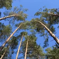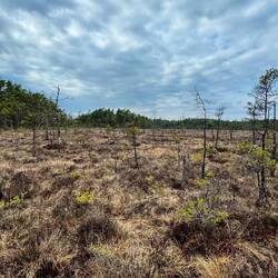 Neben der Tatsache, dass es sehr steil ist, teilweise mit Seilen gesichert, liegen vom Sturm Bäume kreuz und quer und an dem steilen Hang ist es schwer, um die dann drumrum zu turnen. Der Weg geht später wieder einfacher auf einem Damm entlang, zumindest wirkt es so, wenn ich darauf gehe. Er ist obendrauf circa 5m breit, insgesamt unten an seinem Fuß vielleicht 50m breit und gute 20m hoch. Wenn ich es nicht besser wüsste, würde ich annehmen, es ist sowas wie ein alter Bahndamm, ist es aber nicht, sondern tatsächlich ein natürliches Gebilde, was sich über gut 2 km hinzieht. Beidseitig ist Wasser oder auch eine urige Sumpflandschaft mit abgestorbenen Birken. Auf diesem Weg sind eine ganze Menge Kröten unterwegs, ich muss teilweise aufpassen, nicht draufzutreten.