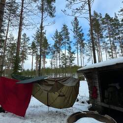 Es hat die halbe Nacht geregnet, trotzdem ist es am Morgen nur um den Gefrierpunkt rum, so dass meine Gasflasche nicht genug Feuer hat, um wirklich Wasser heiß zu machen. Deshalb stelle ich heute auf Flüssiggasbetrieb um, es ist eine Besonderheit, die nur sehr wenige Brenner können. Ich hadere sehr lange mit mir, loszuziehen, da alles recht nass ist, ich nur Schnee im Voraus habe und irgendwie planlos bin. Brauche dann einfach etwas Zeit, um mir ein bisschen was zurechtzubiegen. Alles in allem wird es dabei fast zwölf. Ich werde ab jetzt dem E1 für fast 1000km folgen und komme damit nicht allzu oft durch größere Ortschaften, selbst Dörfer sind rar. Ich stapfe durch den nassen Schnee und nach gut 2 Stunden, ich habe ganze 5 km geschafft, gibt es einen kleinen Unterstand, an dem ich eine Pause mache. Es gibt Sarekbrot mit Kaviarpaste, wie delikat. In gut 3-4 km kommt ein Shelter, der nächste ist dann noch 12 km entfernt. Es ist inzwischen 14 Uhr und so beschließe ich, nur noch den nächsten aufzusuchen und dort ordentlich alles zu trocknen und mich zu ruhen. In ähnlicher Entfernung wie der zweite Shelter gibt es einen Campingplatz, der wohl sogar geöffnet ist. Also will ich morgen recht früh aufbrechen, um dorthin zu kommen. Um halb vier komme ich am Shelter an, spanne eine Leine und hänge alles zum Trocknen auf. Glücklicherweise liegt er nur 10m von einem Bach entfernt, so dass ich mir dort Wasser holen kann und außerdem baden wir früh. Am Abend gibt es eine Gemüsesuppe mit Wiener Würstchen, alles frisches Zeug, was ich bis hierher geschleppt habe und mit großer Freude zubereite und dann verzehre.Read more