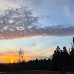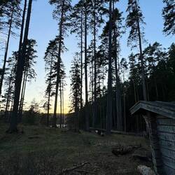 Der Tag startet mit strahlend blauem Himmel und Sonnenschein, das soll auch bis zum Abend genauso bleiben. Ich frühstücke und raffe all mein Hab und Gut nach diesem Wochenende zusammen, verabschiede mich von den zwei freundlichen Nachbarn und mache mich auf den Weg Richtung Norden. In gut 26km Entfernung gibt es einen Shelter am See, den ich mir als Ziel ausgemacht habe. Der Weg führt den gesamten Tag durch Wälder, es ist keine einzige Wolke am Himmel und das macht eine sehr gute Stimmung beim Laufen. Um Mittag rum komme ich durch Tivedstorp. Es ist eine alte Siedlung, wo es verschiedene Gebäude in Museumsart gibt, unter anderem ein Missionshaus, das ich mir ansehe. Das Gelände ist heute nicht so schwierig und steil, wie ich es in den letzten Tagen mehrfach hatte, aber trotzdem ist es ein ziemliches Auf und Ab, was ich so zum Beispiel in Småland nicht hatte. Am Nachmittag komme ich auf den Munkastigen (Mönchspfad), der gleichzeitig hier parallel mit meinen anderen zwei Wanderwegen läuft. Dabei treffe ich zum einen auf eine deutsche Familie, die ein paar Meter auf dem Wanderweg zu ihrem Sommerhaus unterwegs sind. Später, als es kurz an einer Straße entlang geht, treffe ich eine junge Schwedin aus der Region, die ihr Motorrad für diese Saison zum ersten Mal rausgeholt hat. Ich halte meine große Mittagspause heute wieder direkt auf dem Wanderweg, als ich gerade an einem kleinen Bach vorbeikomme, wo ich mir Wasser nehmen kann und dann eine Nudelsuppe mit Schinkenwürfeln und diversen Gewürzen zubereite. Der Weg zieht sich an einer ganzen Reihe von Seen entlang und es ist wunderbar zu laufen, die Vögel zwitschern und ich kann deutlich den Frühling wahrnehmen. Die Knospen sprießen immer mehr, kleine Blätter entwickeln sich, es ist von Tag zu Tag etwas grüner. Als ich am Abend an den See komme, an dem der Shelter ist, herrscht eine magische Stimmung vor. Das Abendlicht ist anfangs noch orangeartig, wird aber immer mehr purpurfarben. Ich richte mich im Shelter ein, er ist relativ groß und genieße den Abend. Dabei höre ich den Gänsen und Kranichen bis in die Dunkelheit zu.