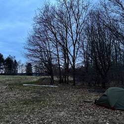 Der Weg zieht sich heute schier endlos von einem Ort zum nächsten Richtung Norden. Und um nicht auf der Bundesstraße laufen zu müssen, gehe ich ganz ordentliche Umwege. Nachmittags um drei habe ich noch nicht mal die Hälfte des geplanten Pensums geschafft und möchte am liebsten aufhören für heute. Immerhin ist es trocken von oben und so reiß ich mich zusammen und gehe weiter. Da mir das ewige Zickzack laufen dann doch zu bunt wird, gehe ich ein paar Kilometer an der Bundesstraße entlang. Da die Straße trocken ist, ist es gar nicht so schwierig und so komme ich um sechs rum abseits der Bundesstraße in ein Dorf und frage nach Wasser und eventuell einem Shelter. Die Empfehlung zielt auf einen See gut 5 km entfernt, an dem es auch einen Shelter gibt und der sogar schon an meinem ursprünglichen Weg liegt. Klingt erstmal gut, aber nachdem ich in diese Richtung aufgebrochen bin, nehme ich wahr, dass ich dann ein Stück rückwärts auf meinem Weg laufen würde. Das geht natürlich überhaupt nicht und mein Sturkopf entscheidet sich, zwar diese Distanz zu machen, aber einfach mehr nördlich zu halten und so komme ich kurz darauf in den Wald. Die Wege sind noch immer gut verschneit. Es zieht sich lange bergauf und es läuft sich angesichts der 15-20cm pappnassen Schnees recht schwierig. Mit den frisch eingekauften Sachen ist der Rucksack auch einigermaßen schwer und so ist es ein wirklich kräftezehrendes Vorwärtskommen. Es sind ziemlich kleine Schritte, die ich in den Schnee stechen muss. Erfreulich sind die neuen Schuhe an dieser Stelle, mit den alten undichten in diesem nassen Schnee hätte ich gleich barfuß laufen können. Aus der geplanten Stunde für diesen Weg werden am Ende fast zwei. Es hat in der Zwischenzeit begonnen zu nieseln und nachdem ich schon sechs oder sieben mal gestoppt habe und der Meinung war, jetzt hier an dieser Stelle einfach das Zelt aufzubauen, ziehe ich doch immer noch mal weiter. Um kurz vor acht habe ich es dann dick, trete mir im Schnee eine Fläche zurecht, auf der ich das Zelt platziere und sehe zu, dass ich halbwegs trocken drunterkomme. Der Zeitpunkt war ganz gut, denn es beginnt ab jetzt richtig zu regnen, was ungefähr die halbe Nacht anhält. Ich esse nur noch ein wenig und bin gespannt, inwiefern der Zeltboden morgen früh auf diesem nassen Untergrund so einigermaßen dicht gehalten hat. Für heute ist sofort Ruhe. Keine Pinguine, keine Nachrichten, einfach Augen zu.