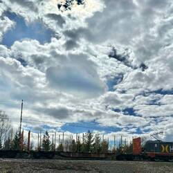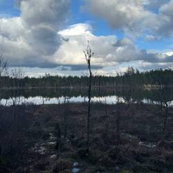 Der Weg geht heute schon gleich am Vormittag an einigen Hochmooren entlang, es sind also weite Grasflächen mit eher Sträuchern und kleinen Bäumen, über die man einen weiten Blick hat. Der Weg führt nicht nur hier ganz häufig über Holzplanken, die über längere oder kürzere Strecken ausgelegt sind, da es doch zu nass zum Laufen ist oder einfach nur die Vegetation vor den Tritten und Schritten der Wanderer geschützt werden soll. Die Wolken bauen sich so wie gestern mit jeder Stunde weiter auf und bilden fantastische Formationen. Auf dem Weg durch die Wälder habe ich immer mal zwischendurch für eine Sekunde einen feinen Geruch in der Nase, er erinnert mich an Fichtennadel-Schaumbad, ist aber viel, viel lieblicher. Den kenne ich auch aus den Jahren zuvor, konnte aber nie ausmachen, welche Pflanze es ist oder wodurch er entsteht. Stehen bleiben und weiter genießen is nich', weil es immer nur für einen kurzen Moment da ist. Um zwei rum höre ich sehr rapide ein Geräusch. Es erinnert mich an einen Jagdflieger und ich gucke auch erst mal nach oben, nehme aber kurz darauf war, dass es ein Schnellzug ist, der einen guten halben Kilometer von mir entfernt mitten durch den Wald hastet. Irgendwo müssen die ja auch lang durch dieses weite Land. Nachdem ich kurz darauf an einer kleinen Unterführung die Trasse gekreuzt habe, mache ich eine Pause. Es ist ein großer freier Platz, sowas wie eine Notfallsammelfläche. Und da das Auge ja bekanntlich mit isst, kommt irgendwann noch ein leerer Holzzug ganz gemächlich hier durchgerasselt. Als ich weitergehen will, merke ich im Gesicht, dass da irgendetwas ist, fühlt sich erst an wie etwas Grind, bis ich merke, dass es eine Zecke ist, die sich unter dem Ohr festgesetzt hat. Natürlich kann ich da ganz schlecht hingucken und deswegen ist es günstig, dass gerade ein Auto auf diesem Platz steht, dessen Außenspiegel ich mir zu Nutze mache und mehr schlecht als recht den Plagegeist entferne.