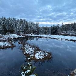 Gegen halb zwei komme ich in den Garphyttans Nationalpark, es wirkt hier irgendwie touristischer als in den letzten Tagen, die Wege sind deutlich breiter und es läuft sich recht einfach. Der Weg zieht sich Stück für Stück wieder höher und so wird auch der Schnee wieder mehr, sogar deutlich mehr als der, den ich zuletzt hatte. Am späten Nachmittag komme ich an den Falkasjön. Ich blicke vor eine steile Felswand und natürlich zieht sich der Weg hinten im Wald in kürzester Zeit bis ganz hoch, so dass ich dann einen wunderbaren Ausblick aus ca. 40 bis 50 Metern Höhe über den See habe. Man will ja für sein Geld auch was geboten bekommen. Hier am See gibt es einen Shelter, den ich erst angepeilt hatte, später aber gesehen hab, dass es nur 1,5 km weiter einen anderen See ebenfalls mit einem Shelter gibt und direkt daneben einen Zeltplatz, bei dem ich heute vielleicht mal nach einer Dusche fragen will. Der versprochene Shelter existiert nicht an der Stelle, immerhin gibt es aber eine Värmstuga (Wärmhütte). Es ist ein großes verglastes Gebäude mit Tischen und Bänken direkt am See, in dem sich Wanderer zwischen 6 und 22 Uhr aufhalten können. Ein Paar kommt mir entgegen und ich frage sie nach dem Zeltplatz und der Dusche: Welch ein Zufall, es gibt hier eine öffentliche sehr gut eingerichtete und sehr saubere, besser als auf manchem Zeltplatz. Auch hier ist von 6 bis 22 der Zugang möglich. Was brauch ich mehr? Sie wollen mir auch gleich am See einen Shelter zeigen, ich orientiere mich aber erst mal zur Dusche. Nachdem ich ausgiebig geduscht habe, sehe ich draußen neben dem Gebäude ein größeren Unterstand, der mich irgendwie anlacht, doch hier zu übernachten, statt wieder runter zum See zu gehen und den Shelter zu suchen. Nachdem ich meine Sachen schon abgelegt habe, entscheide ich mich aber doch, nach Gutsherrenart in einem Shelter zu schlafen und gehe runter zum See.
