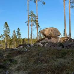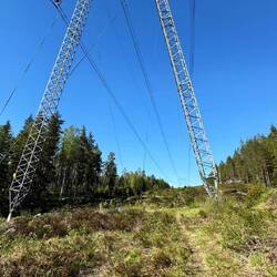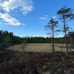 Nachdem ich bei Hanna im Haus gefrühstückt habe, verabschiede ich mich und gehe um neun los. Die Sonne steht wieder hoch. Der Weg ist ein Schotterweg, der rechts und links sehr breit ohne Bäume ist, so dass es völlig ohne Schatten ist. Der Weg ist heute nur der E1, also kein lokaler Wanderweg und dementsprechend gibt es auch keinerlei Markierungen und ich muss öfter mal in der Karte nachsehen. Das steigert sich noch weiter, so dass ich irgendwann im Wald stehe, es gibt nichts und es gibt auch keinen Pfad mehr, der in irgendeiner Form an Wanderer erinnert. Dementsprechend ist es mehr ein Irren und immer wieder nach der Karte versuchen, die Richtung zu halten. Das ganze mache ich so lange, bis irgendwann eine Wegkreuzung kommt und es ab da wieder auf einen echten Weg geht. Es dauert nicht allzu lange, dann geht es wieder in den Wald rein, hoch auf den Dragberget. In gut 6 km soll es dort einen Shelter geben und es lässt sich erst mal gleich ziemlich steil an. Gegen halb zwölf erreiche ich das Plateau, es ist hier oben etwas karger bewaldet, es ist viel swampy Grassland. Der Weg ist wieder besser markiert, trotzdem ist auffällig, dass gegenüber vielen anderen solchen Landschaftsarten wenig Holzplanken ausgelegt sind. Der Pfad ist auch nur schlecht erkennbar, weil es so nass ist, dass die Spuren, die man im nassen Sumpfland hinterlässt, schon nach kurzer Zeit wieder verschwunden sind. Und so kämpfe ich mich auf dieser Anhöhe durch wirklich derb nassen Untergrund. Es läuft sich gefühlt noch schwerer als bei dem nassen Schnee vor einigen Wochen. Dazu kommt, dass ich häufig so weit einsinke, dass die Höhe der Wanderschuhe gar nicht mehr ausreicht. Zweimal schaffe ich es bis zum Knie, dann ist es ziemlich aufwändig, das Bein wieder rauszukriegen, da sich der Schuh im Untergrund richtig gut festsaugt. Diese Art der Landschaft, also Hochmoor beziehungsweise Sumpfland ist für mich trotzdem weiterhin eine der faszinierendsten hier in Schweden. Auf dieser Anhöhe, die circa auf 500m über dem Meeresspiegel ist, gibt es auch einen richtig großen Antennenmast, er ist nur wenig niedriger als der Berliner Fernsehturm. Wenn es nicht bei Strafe verboten wäre, würde ich da zu gern hochklettern.