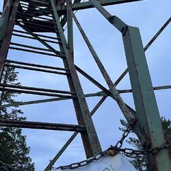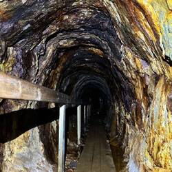 Gegen fünf erreichen wir einen Aussichtsturm, er steht auf dem Gelände einer alten Bergbauanlage. Hier sieht man noch die alten Stollenanlagen und auch rundherum kleinere Halden. Bis in die Achtzigerjahre ist hier noch gearbeitet worden. Und als wir gerade weitergehen, entdecken wir am anderen Ende des Geländes einen Eingang, dessen Tür zwar zu, aber nicht verschlossen ist. Natürlich gucken wir rein und kommen zu einem circa 50 m langen Stollensystem dass wir mit der Stirnlampe auch von innen begehen können. Es ist richtig kalt und dieser Gang führt zu einem der Stollen, die wir vom Turm aus sehen konnten.