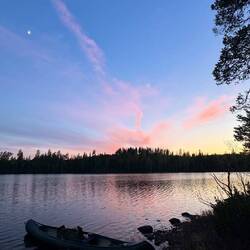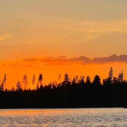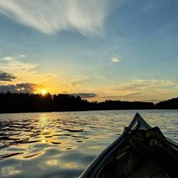 Gegen halb sieben komme ich dann nach Kloten, wo dieser schöne Bergslagsleden endet. Es sind natürlich auch nur ein paar Häuschen, aber es gibt einen lokalen Veranstalter für Elch- und Biebersafaris. Man kann hier außerdem Fahrräder, Kanus und dergleichen ausleihen. Ich steuere auf den kleinen Laden zu in der Absicht, mir ein Eis und ein Bier zu genehmigen und ganz nebenbei, als der Besitzer Michael draußenrum einräumt, fragt er mich, ob ich denn wüsste, dass ich die nächsten 10 km auch mit dem Kanu zurücklegen kann. Der See verläuft nämlich ziemlich parallel zum Wanderweg. Auch wenn es Geld kostet, lasse ich mich da nicht zweimal bitten und so bin ich um kurz nach sieben bereit. Alle Formalitäten sind geklärt und ich starte Richtung Norden. Und so werde ich am ersponnenen Seetag wirklich noch zum Kreuzfahrer. Wer hätte das gedacht? Ich kann das Kanu in Nyfors am nördlichen Ende des Långvattnet bei der River Lodge anschließen und von da aus weitergehen. Zeit habe ich dafür bis morgen früh um neun. Bei diesem herrlichen Wetter, außerdem durchgehend Rückenwind, ist es wirklich eine große Freude, ein Stück des Weges so zurückzulegen. So viele Wasservögel, die auf den kleinen Inseln brüten, ganz aus der Nähe zu sehen und überhaupt mal nicht vom Land aufs Wasser zu gucken, ist einfach herrlich. Es ist einer der schönsten Sonnenuntergänge an diesem Abend, die ich überhaupt auf dem Weg hatte und ich komme auch an den Sheltern vorbei, die ich mir für den Abend ursprünglich ausgeguckt hatte, fahre aber noch eine ganze Ecke weiter und möchte soweit in der Nähe des nördlichen Ziels übernachten, dass es morgen früh sicher ist, pünktlich dort anzukommen. Ich finde dann eine kleine hölzerne Plattform im Wasser, die kaum groß genug ist, dass ich mich darauf legen kann. Aber genau die mache ich mir zurecht, um ab halb elf mit kaum Mücken außenrum direkt im Schlafsack zu übernachten.