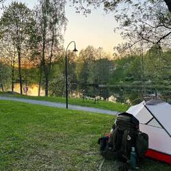 Der Weg nach der Stromtrasse geht dann nur noch bergab, dementsprechend läuft es sich recht leicht. Am Abend komme ich nach Smedjebacken, im Ort an einem Restaurant vorbei, ein lokales Värdshus, das klingt für mich nach echter schwedischer Kost. Als ich reingehe, höre ich eine ganze Menge von Stimmen und denke so „Wow, gut besucht die Stube“. Tatsächlich stehe ich aber mitten in einer privaten Feier. Ich unterhalte mich nur ganz kurz mit zwei Leuten, um dann weiterzuziehen, denn hier gibt es einen Supermarkt. Um 19:55 Uhr marschiere ich ein und stelle dabei fest, dass er um acht schließt, ich hatte bis um neun vermutet, so nehme ich nur 2-3 Teilchen für den Abend und mache mich 500m entfernt im Stadtpark schlafbereit. Dabei kann ich 30 Meter entfernt im Fluss einen Bieber beobachten. Morgen früh werde ich noch einmal im ICA antreten und für die nächsten 3-4 Tage einkaufen, dann steht erst wieder der nächste Markt an.Read more