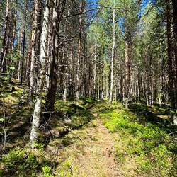 Der Weg führt recht angenehm durch Birken- oder Kiefernwwälder, es ist nicht sonderlich viel Steigung dabei, so dass ich gut vorwärts komme.