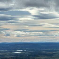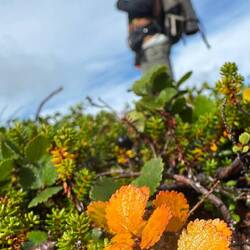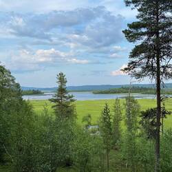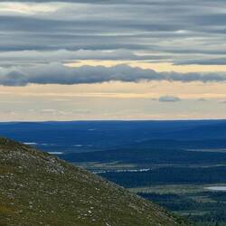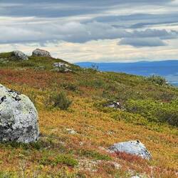 Für um vier ist der Wecker gestellt. Das wird aber auch seine Sache bleiben. Um diese Zeit existiert ja noch keine Realität und so rappeln wir uns erst gegen sieben auf, um nach dem Frühstück um neun aufzubrechen. Gut, dass wir das heute machen. Das Wetter ist toll, wunderschöne Wolken am Himmel und von Regenwetter weit und breit keine Spur mehr. Da es zumindest laut unserer Karte keinen Pfad gibt, gehen wir auf Richtung durch das hier unten noch vorhandene Strauchwerk und den Wald, in dem teils moosig sumpfig nassen Untergrund ist das schon etwas aufwändiger. All die feinen Details, die das Wandern aber offenbart, machen das Zickzacklaufen um die Bäume herum ganz angenehm. Auf der Tour auf zwei Rädern habe ich all diese Sachen wie Pilze, Beeren und Pflanzen nicht so wahrnehmen können, wie ich es heute wieder tue. Dazu die deutliche Erkenntnis, dass es Herbst wird. Hier und da gelbe, orange oder rote Verfärbungen an den Blättern, reife Beeren und Pilze und auch der Geruch an verschiedenen Stellen sind deutliche Zeichen. Nach einiger Zeit kommen wir auf einen ATV-Track, dem können wir folgen bis ganz hoch auf den Berg. Waren die Mücken unten im Wald noch recht unangenehm, sind sie auf der Höhe ab der Baumgrenze durch den heftigen Wind kein Thema mehr. Stück für Stück öffnet sich der Blick rundherum weit übers Land, die sanften Hügel und Seen bis hin in die schneebedeckten Berge in Norwegen in über hundert Kilometern Entfernung. Das ist angesichts dieser eher flachen Tundra-Landschaft hier absolut beeindruckend. Gegen elf erreichen wir die nördlichste Spitze dieser nord-südlich verlaufenden kleinen Bergkette. Gerade mit dem Fernglas sind die Orte im näheren Umkreis bis zu 50 km auszumachen, mein Interesse gilt natürlich besonders Lannavaara und den Seen rundherum, die ich im Winter alle in gefrorenem Zustand erwandert habe. Eine Alubox auf der Bergspitze, deren Deckel mit etlichen Steinen gegen den Wind beschwert ist, enthält ein paar Bücher über Glaube und Hoffnung, hier ist der laestadianische Einfluss in dieser Gegend deutlich zu spüren. Das in schwedisch geschriebene Buch über Hoffnung nehme ich mit und werde es mir bei passender Gelegenheit zu Gemüte führen. Von dieser Spitze auf etwas über 700 m zieht es sich zu den anderen zweien in südlicher Richtung noch einmal durch eine Senke, in der wir uns Blaubeeren und auch einer ganzen Menge Moltebeeren bedienen können. Was für ein grandioser Abschluss der ganzen Tour hier oben auf diesem Berg. Das ist das Gefühl, das ich angesichts der endlos weiten Sicht, des tollen Wetters, der mystischen Licht- und Wolkenkonstellationen und der gesamten Umstände habe. Von meinem Dorf kann ich zumindest einen Teil von hier oben erkennen, auch den Hügel, auf dem ich die ach so dunkle Winterzeit aufregend bunt und schön durchlebt habe. Gegen zwölf haben wir den für uns südlichsten Punkt erreicht und lassen uns hinter einem Steinhaufen etwas windgeschützt zur Mittagspause nieder, während einige Raben und Falken neben uns auf der selben Höhe den starken Wind nutzen, um völlig mühelos einfach ausgebreitet zu segeln. Gegen eins heißt es dann, den Rückweg anzutreten, wir haben uns für um vier bei Nina und Francisco zum Kaffee angemeldet. Es bleibt die ganze Zeit die Faszination über die weite Sicht zurück bis Karesuando und vor allem die schneebedeckten Berge so weit im Westen. Bergab folgen wir dem Pfad bis zur Straße, auch wenn der einen guten Kilometer vom Auto entfernt ankommt. Dafür ist er schneller zu laufen und wir treffen auch noch einen deutschen Radler, der auf dem Weg zum Nordkap hier gerade pausiert. Gegen drei sind wir am Auto zurück und nun heißt es flinke Füße. Ich möchte unbedingt das restliche Stück mit dem Rad fahren und habe nur noch eine Stunde Zeit. Dass es statt der gedachten 20 doch knappe 30 km sind, erhöht den Druck einerseits, die abgehängten Packtaschen beschleunigen allerdings die Fahrt andererseits. Und so trete ich rein, was das Zeug hält, um tatsächlich pünktlich um vier vor Ort zu sein, wo in diesen Tagen Franciscos Vater aus Argentinien zu Gast ist, der gerade heute seinen 80. Geburtstag feiert. Für uns eine besondere Freude, dem beizuwohnen. In wunderbar sonniger, spätsommerlicher Atmosphäre sitzen wir draußen zusammen, es ist etwas von allem, Wiedersehensfreude und Abschied in so vertrauter Umgebung zugleich, schließlich heißt es morgen für uns weiterzuziehen. Dank der Einladung der beiden können wir in den Räumlichkeiten übernachten, die ich über die ganzen Monate genutzt habe. An dieser Stelle sage ich euch Dreien, inzwischen korrekter gesagt Vieren mit dem Rentierkälbchen Greta, meinen ganz herzlichen Dank, dass ihr mich wie einen Sohn aufgenommen habt und wir zusammen eine so unglaublich tolle Zeit miteinander hatten.